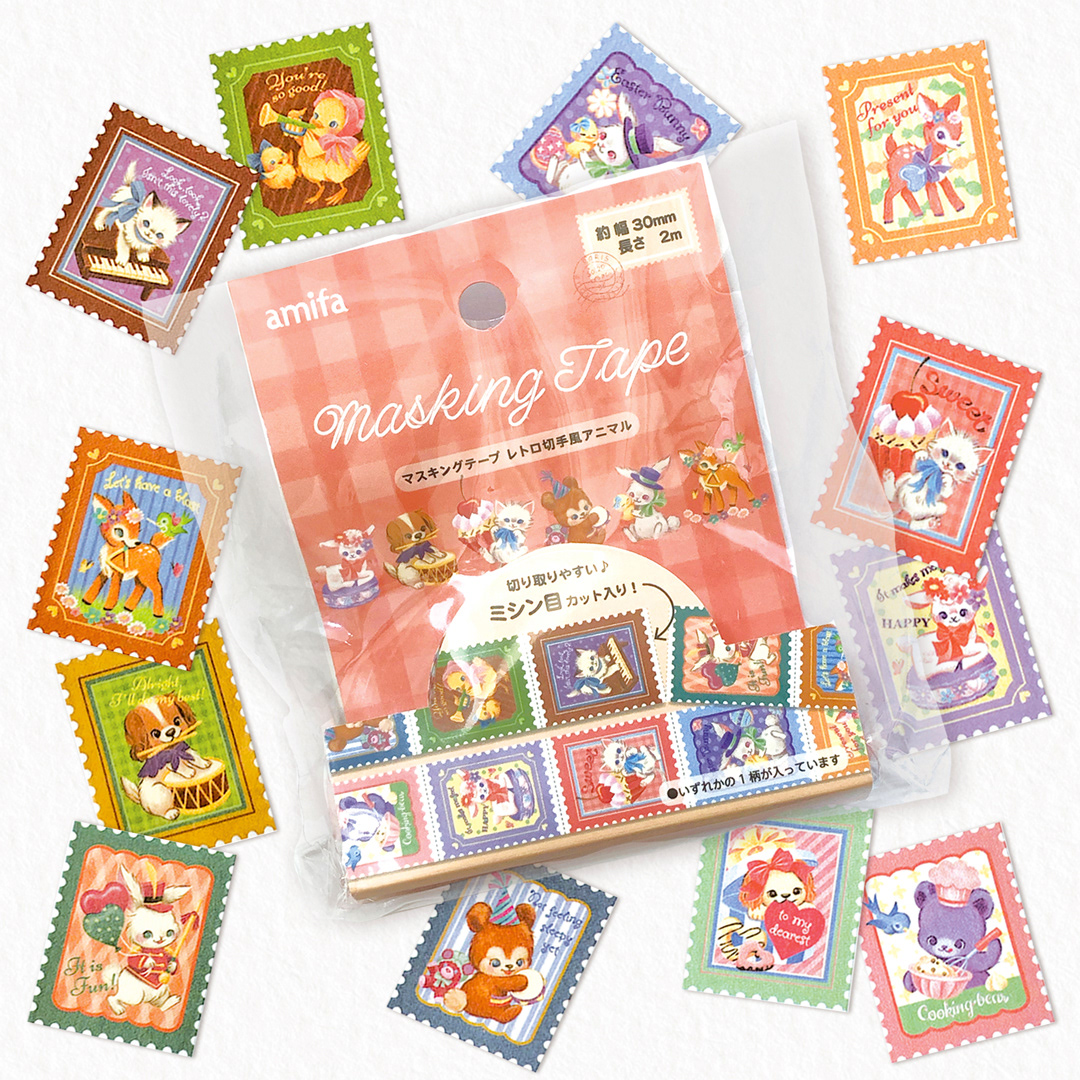 レトロ風アニマルがモチーフで、切り離すと切手のように見える仕様です。